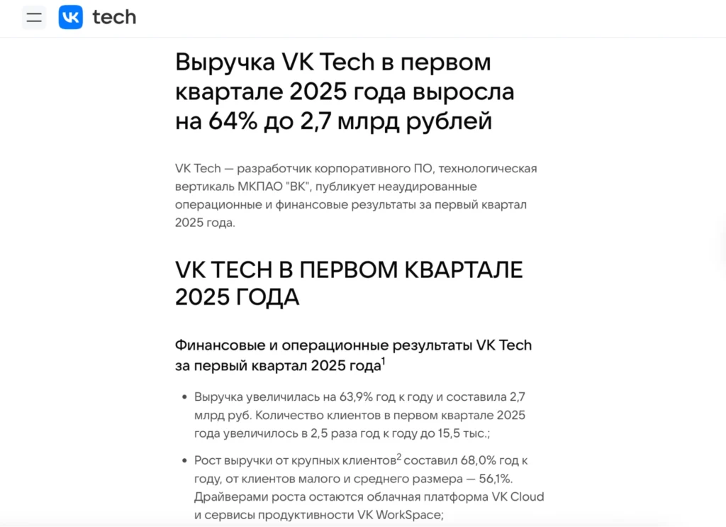 • 1/2Раскрытие финансовых результатов VK Tech за первый квартал 2025 года